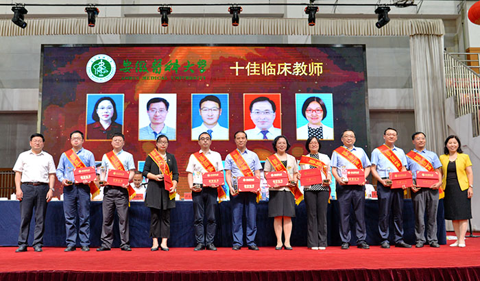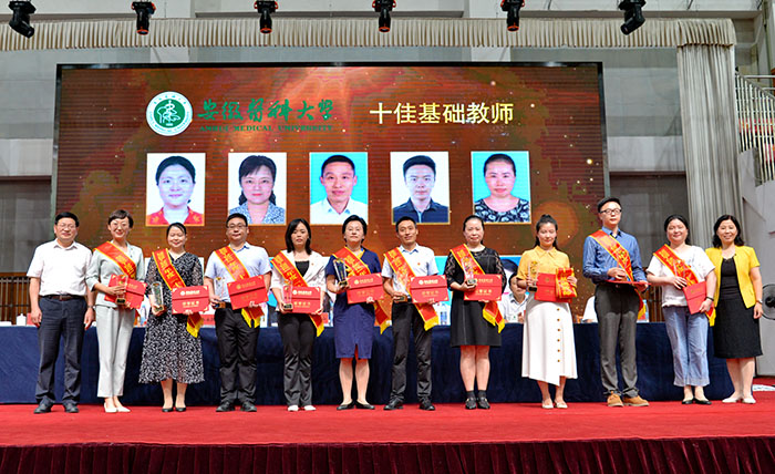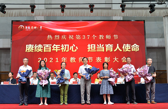校领导分别为校2020-2021年“十佳基础教师”“十佳临床”教师以及优秀教师、优秀教育工作者代表颁发了荣誉证书和奖杯。会上还为退休教职工代表和工作满35年的在职教职工代表颁发纪念奖杯并送上鲜花。