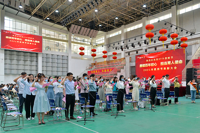 校“十佳基础教师”杨雁带领新进教职工面向国旗庄严宣誓。工作满35年教职工张晓丽、校“十佳临床教师”陈明卫、“十佳基础教师”杨润怀分别作为教师代表发言。