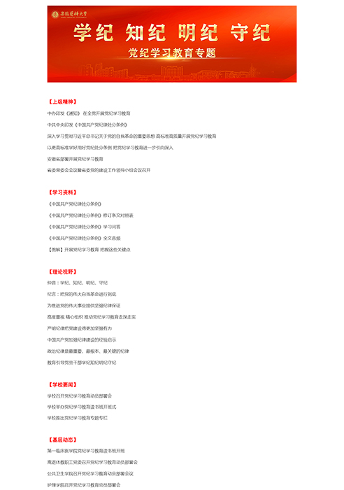 该专题设有“上级精神”“学习资料”“理论视野”“学校要闻”“基层动态”等5个栏目,集部署、学习、服务、展示等功能于一体,既有党中央、省委关于开展党纪学习教育的重要文件、重要会议精神和决策部署的传达宣传,又有学校开展党纪学习教育进展情况和实际成效的集中展示,还有对校院二级党组织开展党纪学习教育动态的及时报道。专题还为广大师生提供权威媒体、专家关于党纪学习教育的重点解读等理论学习资料,为党纪学习教育走深走实营造良好学习氛围,进一步引导全校广大党员、干部认真学习《中国共产党纪律处分条例》,做到学纪、知纪、明纪守纪。